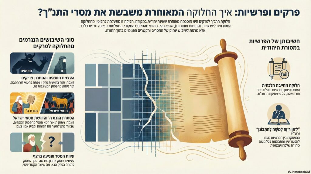 החלוקה לפרקים מתעלמת לחלוטין מהחלוקה לפרשיות פתוחות או סתומות, בין אם ההתעלמות היא במזיד ובין אם מחוסר ידיעה התוצאה היא שיבוש חמור.