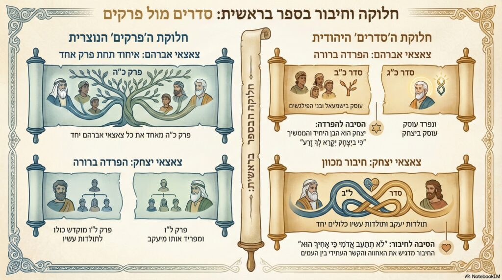 סדרים כב, כג בבראשית מפרידים שני עניינים שהפרקים מאחדים.